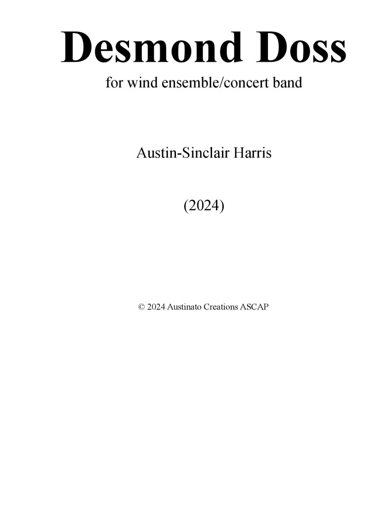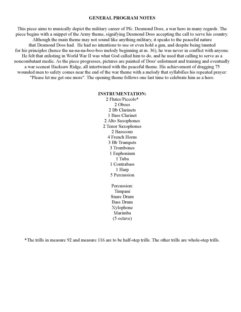 This piece aims to musically depict the military career of Pfc. Desmond Doss, a war hero in many regards. Although the introduction and main theme may not sound like anything military, it speaks to the peaceful nature that Desmond Doss had. He had no intentions to use or even hold a gun, and despite being taunted for his principles (hence the na-na-na-boo-boo melody), he was never in conflict with anyone. He felt that enlisting in World War II was what God called him to do, and he used that calling to serve as a noncombatant medic. As the piece progresses, each phase of Doss’s career takes shape: his enlistment, his training, and being in the midst of war at Hacksaw Ridge, all intertwined with this peaceful theme in a rondo-like form