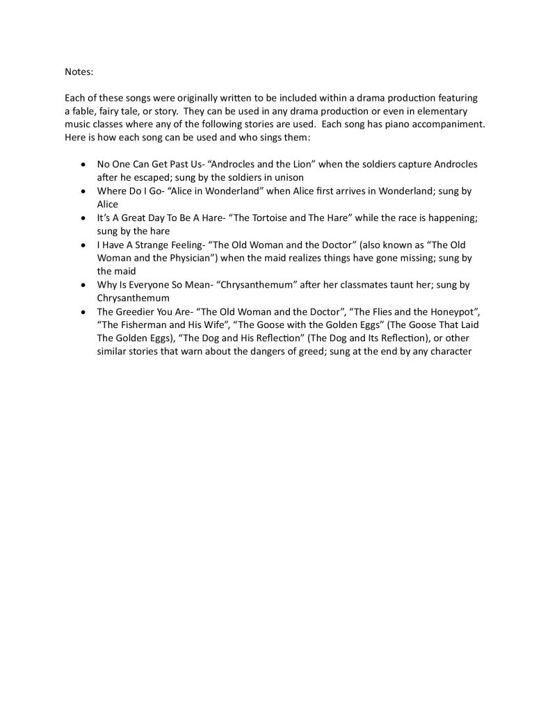 Each of these songs were originally written to be included within a drama production featuring a fable, fairy tale, or story. They can be used in any drama production or even in elementary music classes where any of the following stories are used. Each song has piano accompaniment. Corresponding stories include Alice in Wonderland, The Tortoise and The Hare, and Androcles and the Lion.